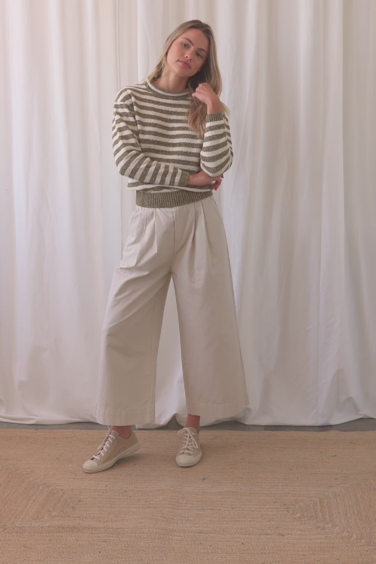 The Tigalda’s rolled neckline and tactile stripes make for a truly versatile knit that is just as at home during spring/summer evenings as it is during colder months.