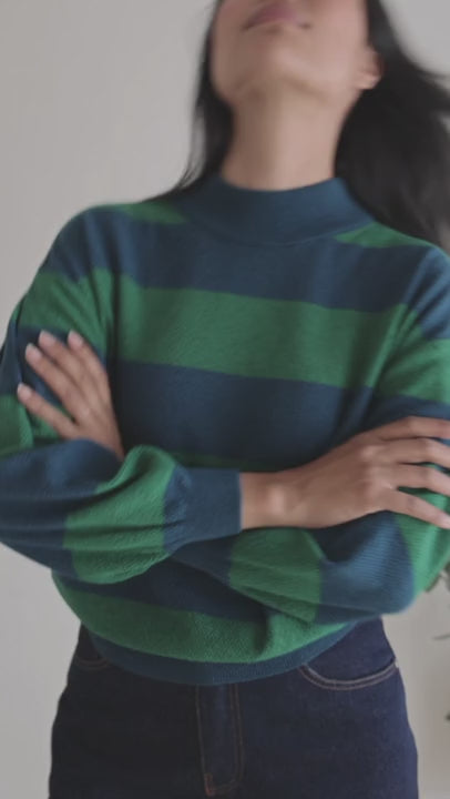 Made entirely from recycled yarn, the Sebastiana knit sets the bar for chic and sustainable women’s fashion. It has a high ribbed neckline and balloon sleeves.