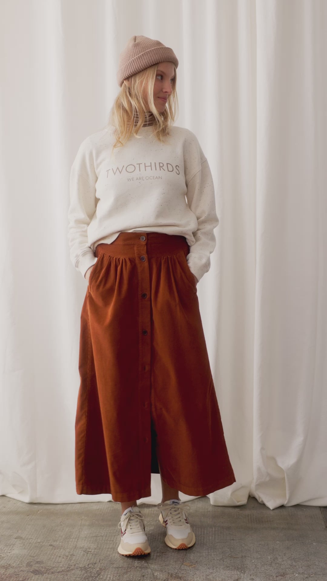 Der nachhaltige Rock Castlerock ist aus wunderschönem Mikrocord gefertigt und hat vorne und hinten eine einzigartige V-förmige Passe. Seitentaschen sowie einen elastischen Bund hinten.