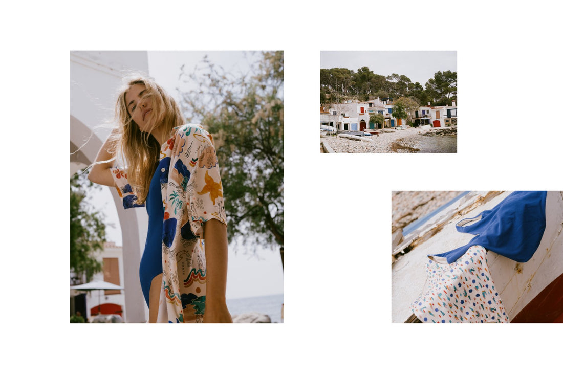 Eine Bademoden-Kapsel führt die kreativen Fäden der Kollektion zusammen. Badeanzüge und Bikinis im Vintage-Stil, aus recycelten Materialien gefertigt.