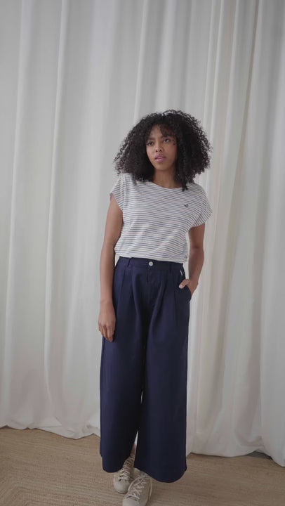 Eine nahtlose Schulterpartie gepaart mit einem weiten Halsausschnitt und Flügelärmeln beim Evia, einem T-Shirt, das den weichsten Slub-Jersey-Stoff mit garngefärbten Streifen und unserem gestickten Wal kombiniert.