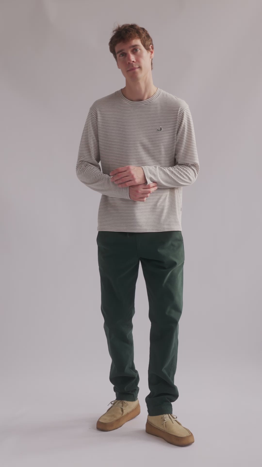 Ein nachhaltiges Langarmshirt mit auffälligem, horizontalem Nadelstreifenmuster, das durch einen kontrastierenden gestreiften Ausschnitt und unser Markenlogo auf der Brust perfekt ergänzt wird.