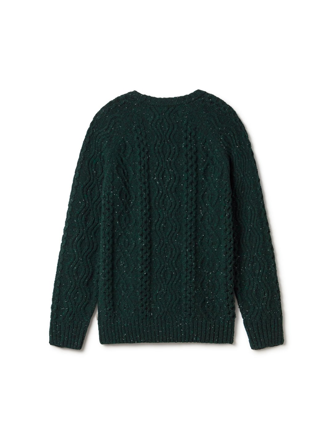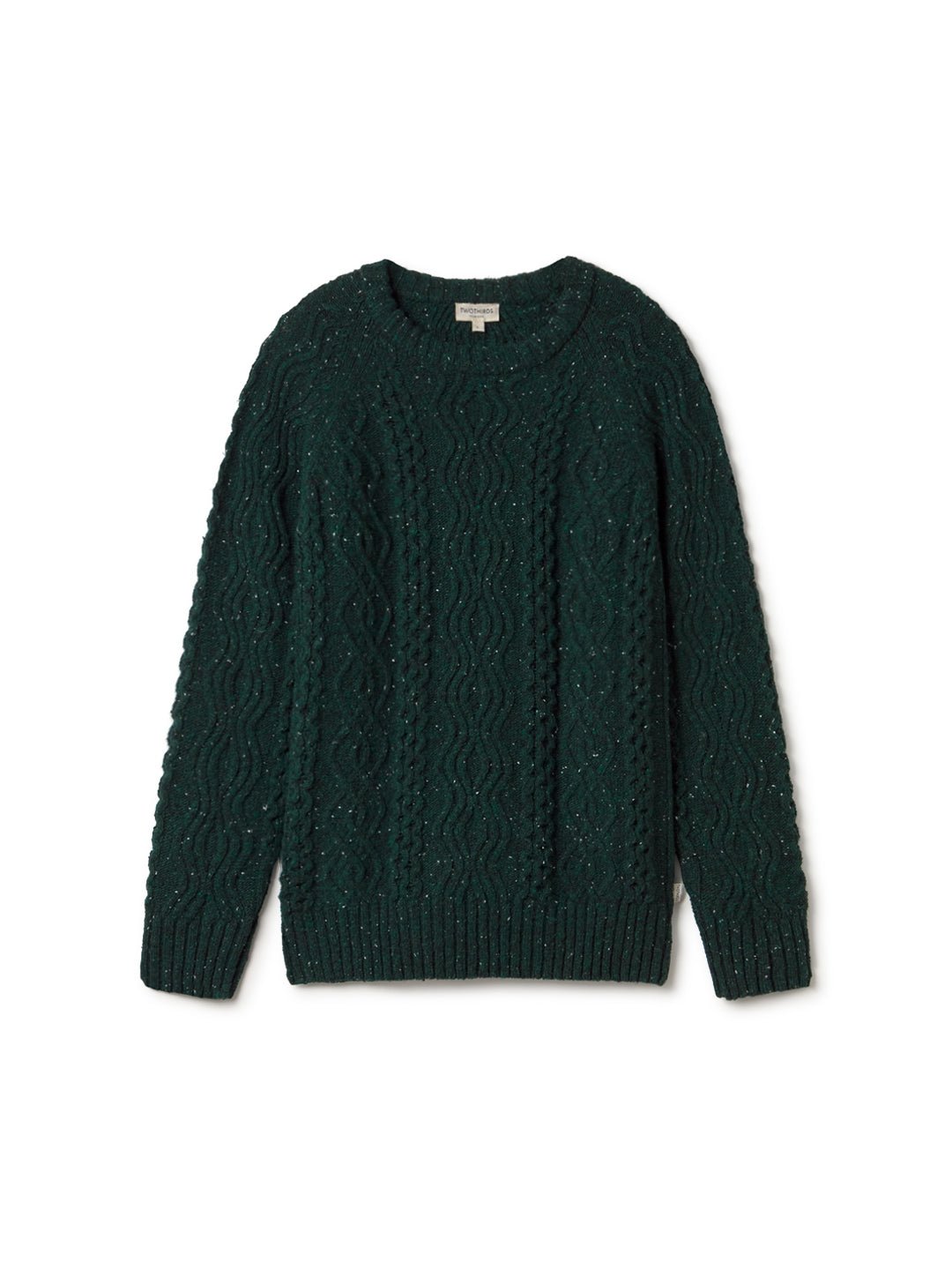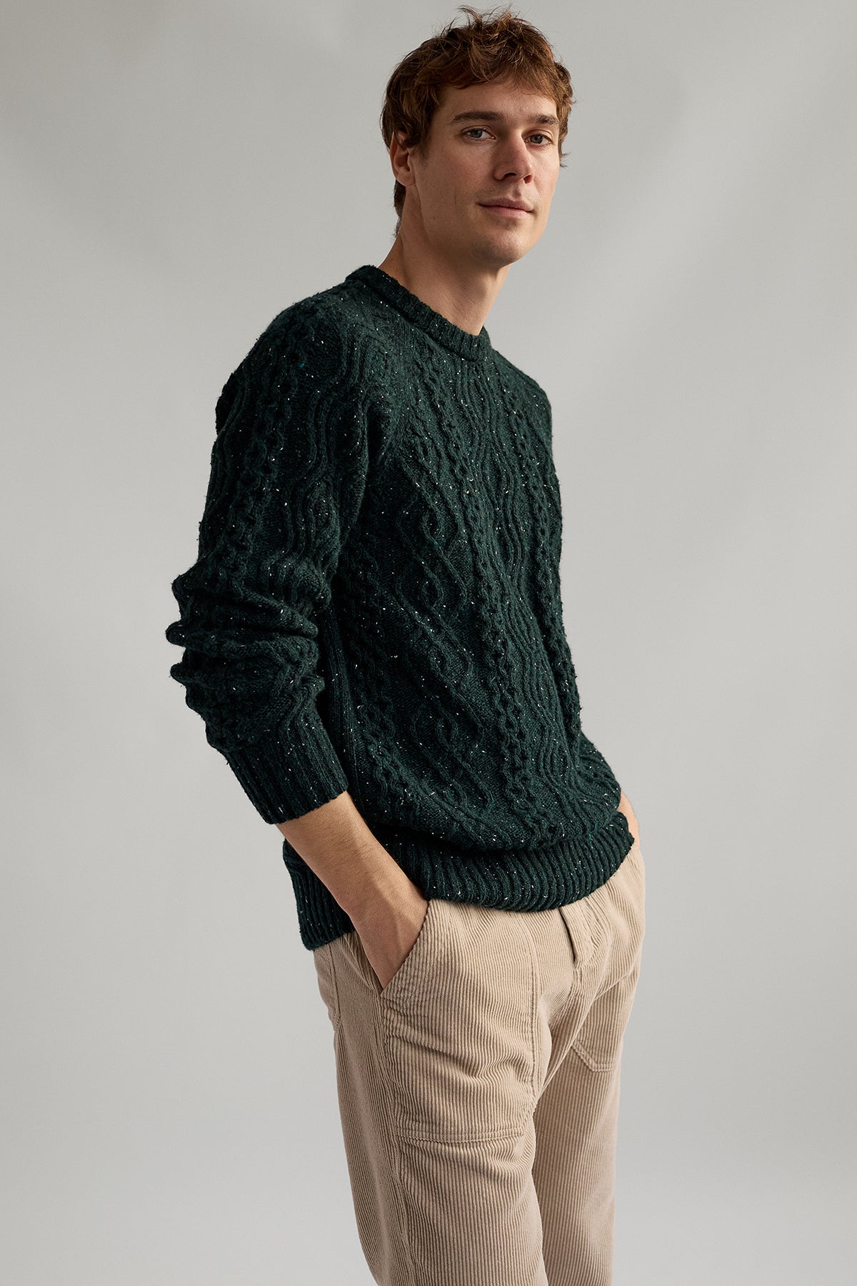 Dieses nachhaltige Aran-Strickmuster besteht aus einer Mischung aus 100% recycelten Materialien, hilft Abfall zu reduzieren, den Einfluss zu verringern und vermittelt robuste Fischer-Vibes.