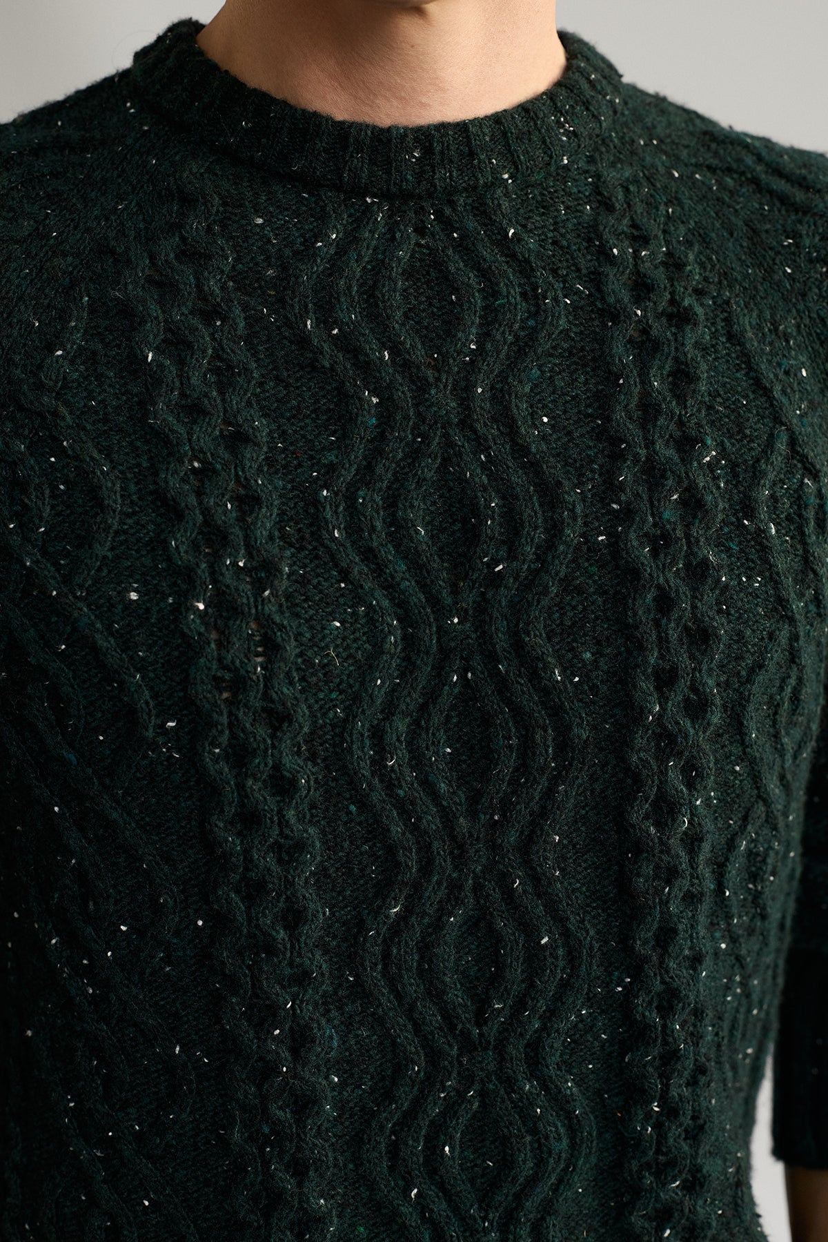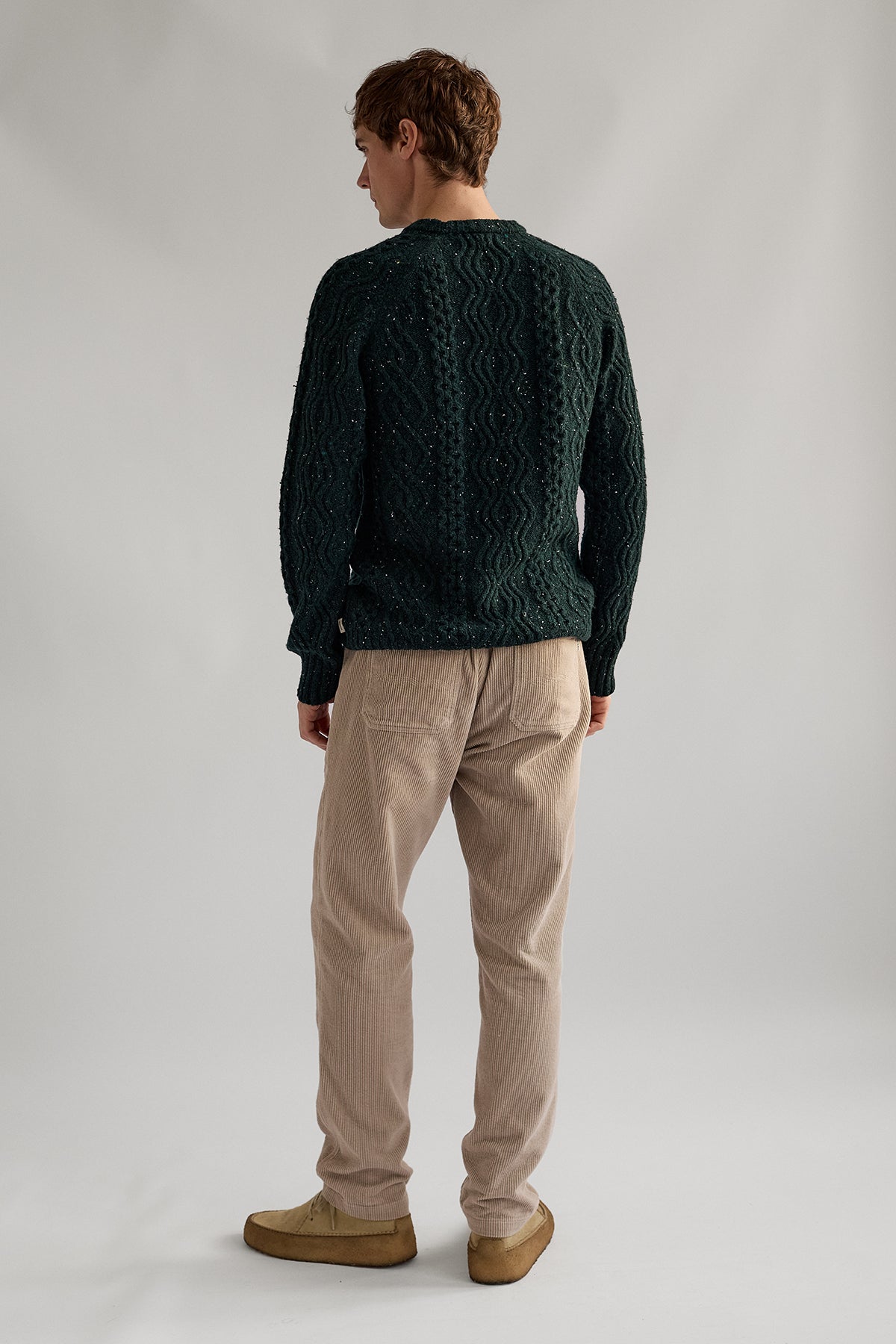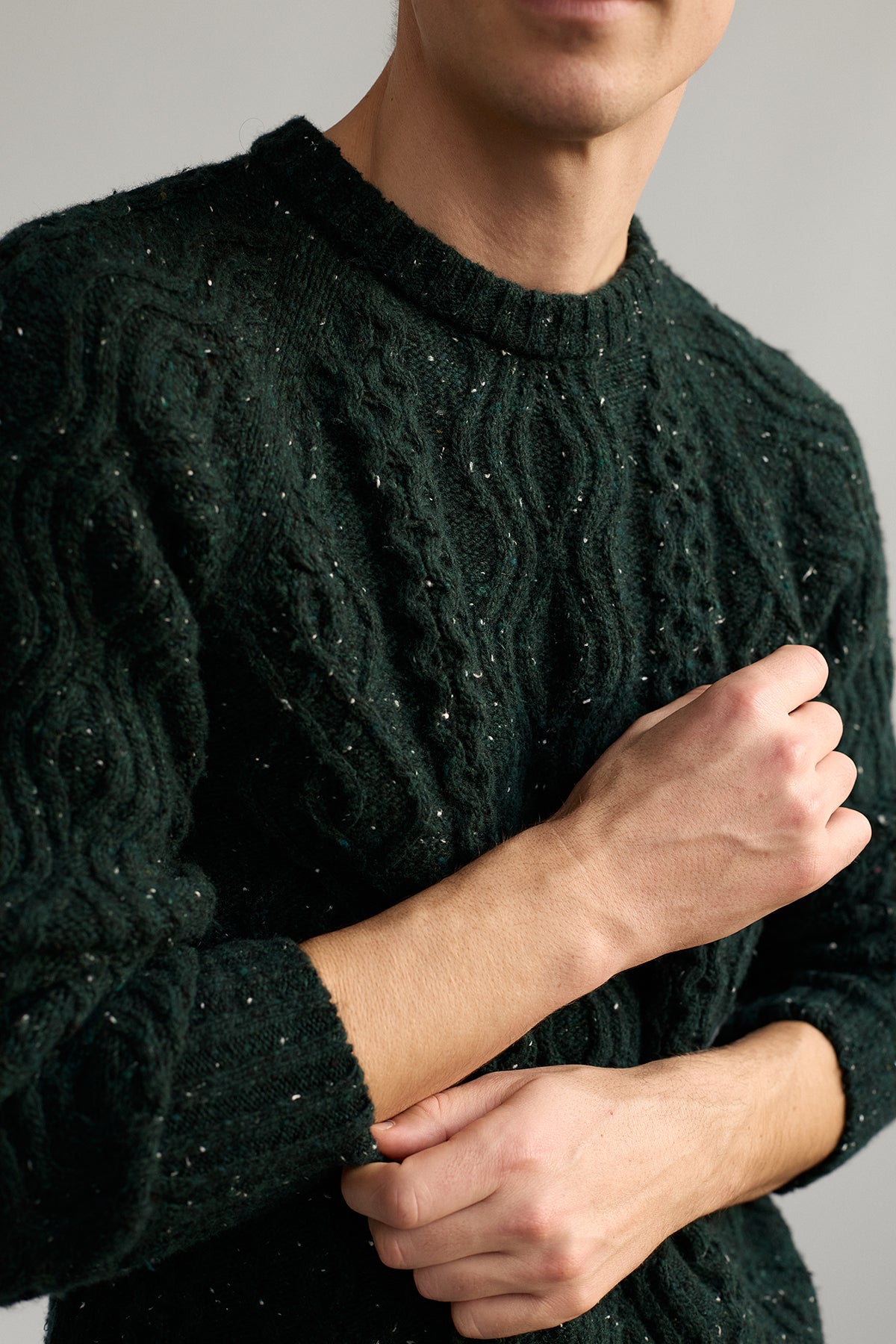 Dieses nachhaltige Aran-Strickmuster besteht aus einer Mischung aus 100% recycelten Materialien, hilft Abfall zu reduzieren, den Einfluss zu verringern und vermittelt robuste Fischer-Vibes.