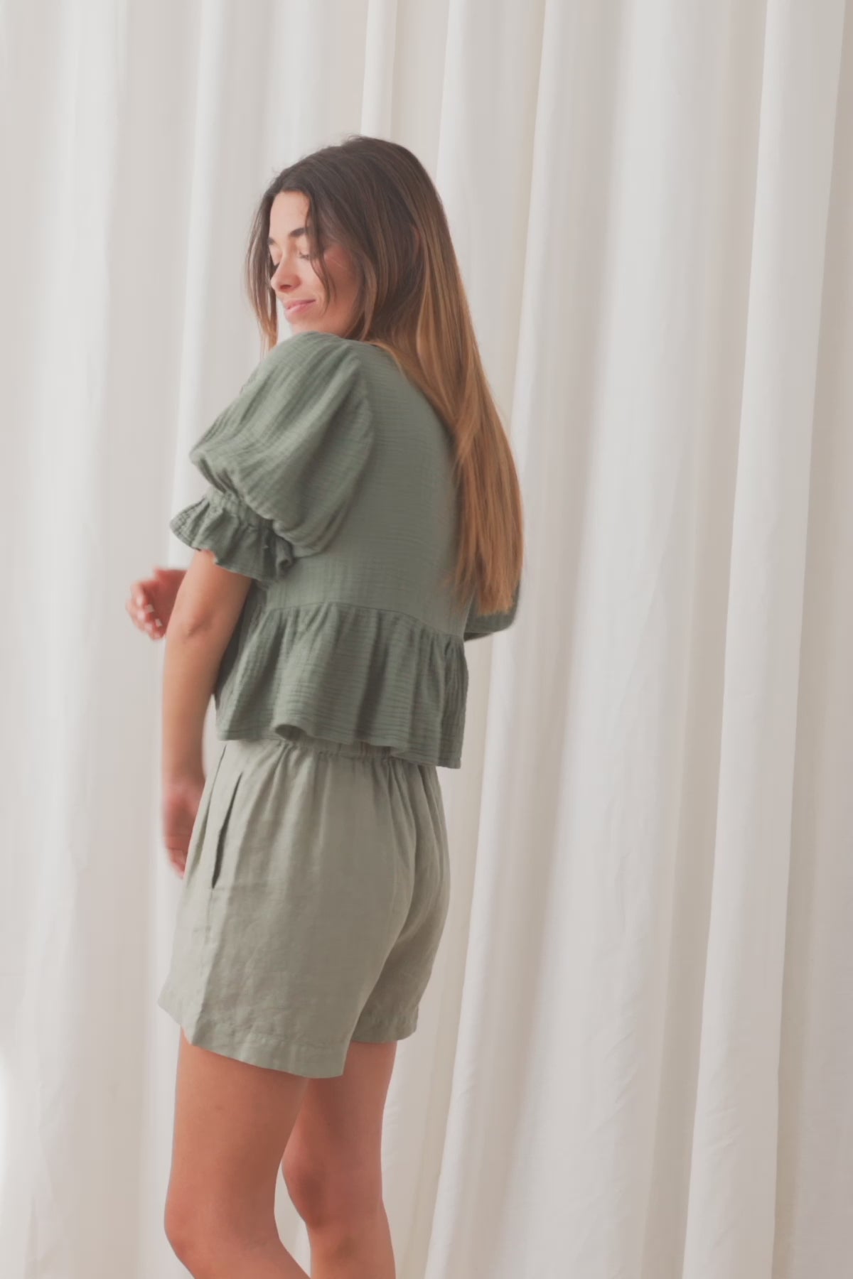 Hergestellt aus Bio-Musselin, der so leicht ist wie Sommerwolken. Das Vasilyevsky ist ein kurz geschnittenes Hemd mit übergroßen Ärmeln und elastischen Bündchen, die bis über den Ellenbogen geschnitten ist.