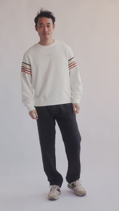 We love a stripe here at TWOTHIRDS! The Parseval sustainable sweatshirt harnesses five of them on each sleeve. Our brand name also features, printed flat on the sternum.