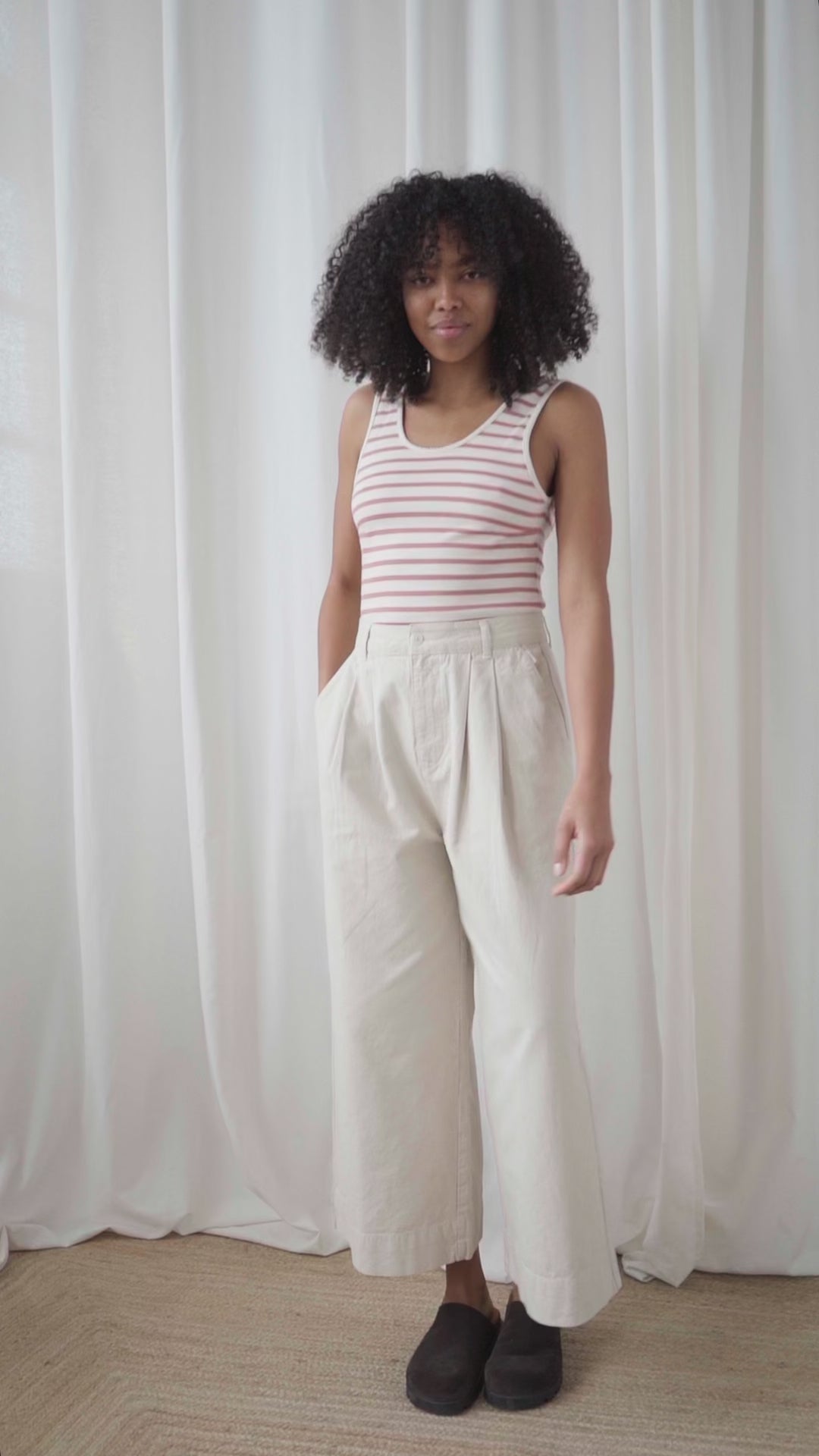 This palazzo-style pant is made from a robust and stylish low impact canvas fabric, making it the perfect transitional piece. Features side pockets, dart detailing at the back and pleats at the front.