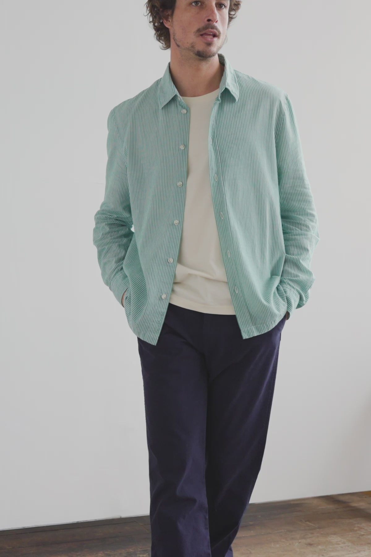Classic vertical stripes, the most eco-friendly of fabrics: our Ildefonso shirt pops, with a “Twothirds” embroidered placket and side cuts. A true Mediterranean look!