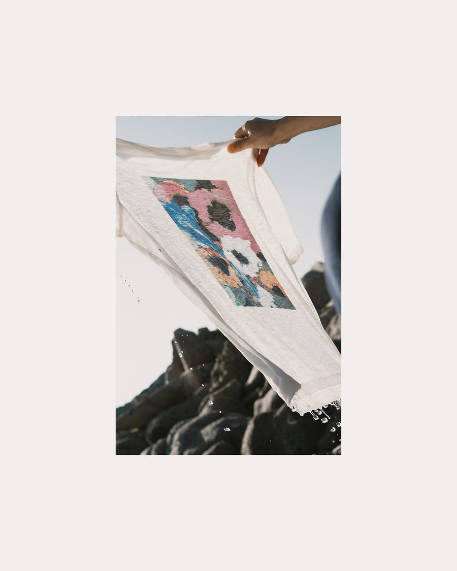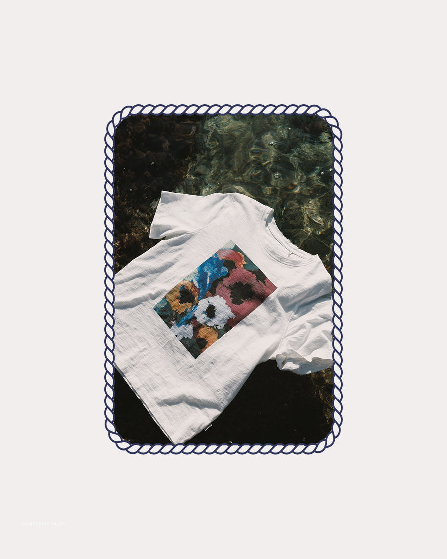 One of Karl's original floral paintings is given new life on our t-shirts and sweats. Neutral tones are complimented by pink brushstrokes, vibrant accents that appear across the collection.