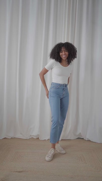 Mom fit is the trend that just won’t quit. These ocean denim jeans put a sustainable twist on the mom fit, adding a “TWOTHIRDS” embossed button and wave embroidered back pockets.