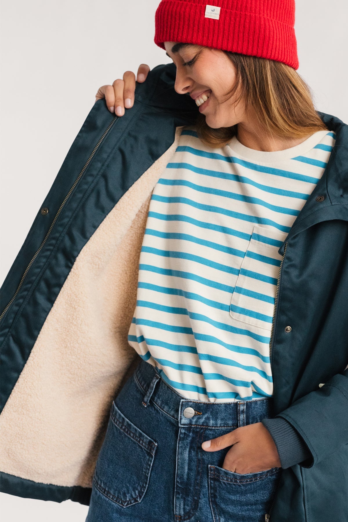 A high neck design with an organic cotton drawstring locks in the warmth created by this stunning canvas parka. A cosy hood, zip placket and sherpa fleece lining keep elements at bay.