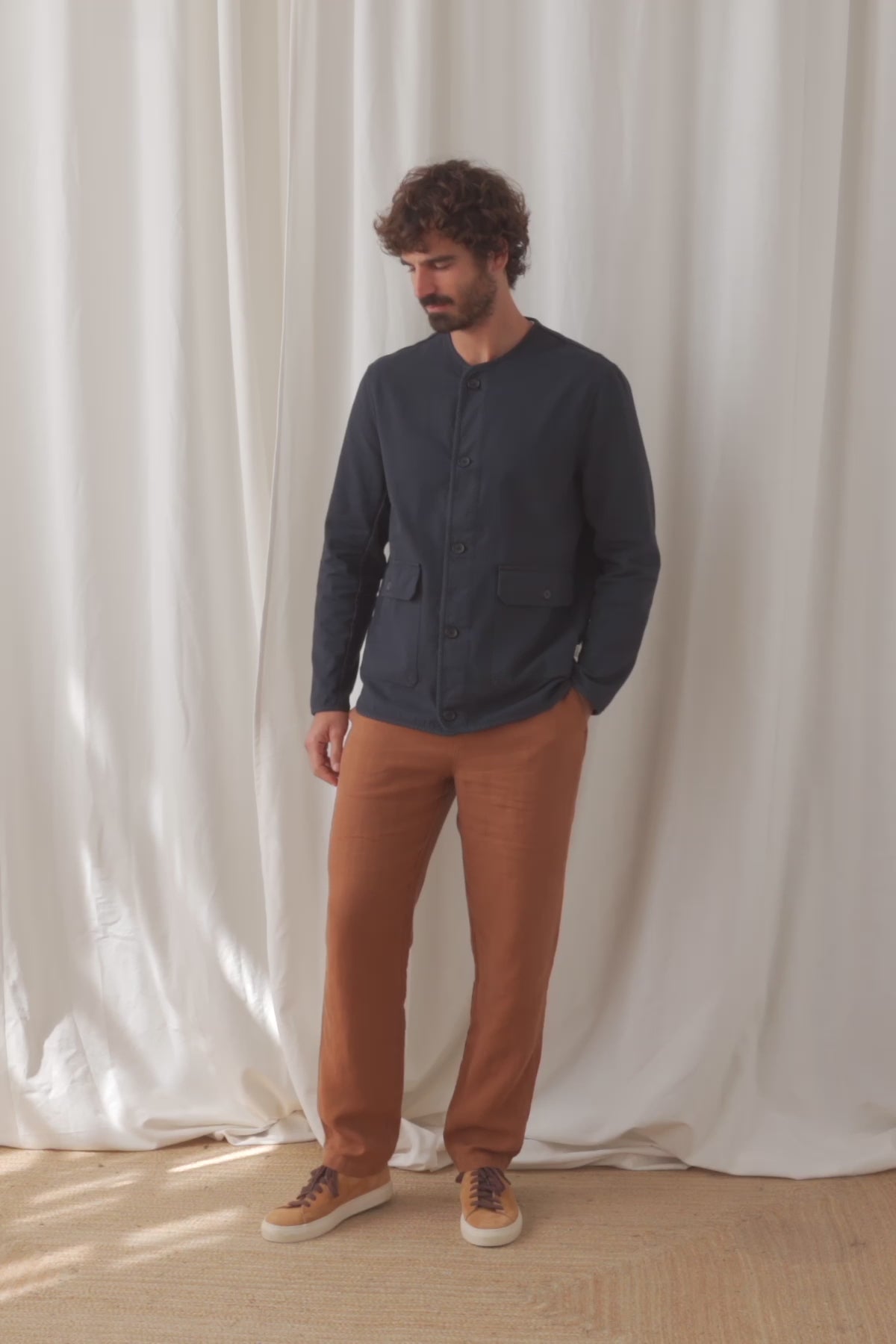 Une veste légère faite en toile issue de deadstock à la conception époustouflante. Une pièce sans col avec de poches à l'avant.