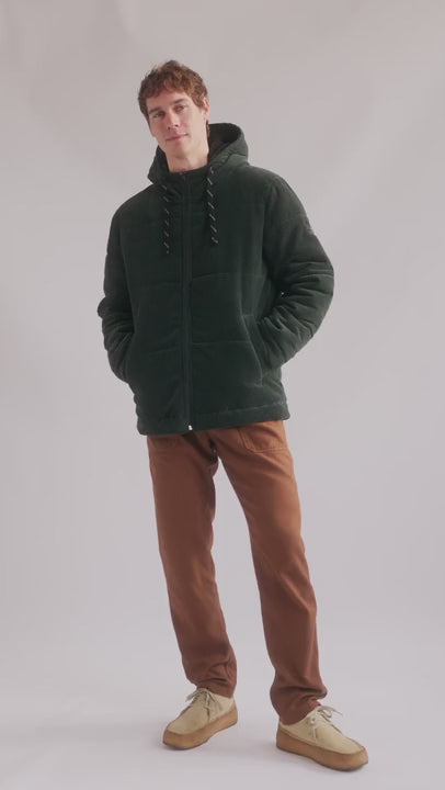 Il y a une veste d'hiver matelassée en ville, fabriquée à partir d'une combinaison de velours côtelé doux à l'extérieur et de polaire sherpa recyclée à l'intérieur. Même son rembourrage est recyclé !