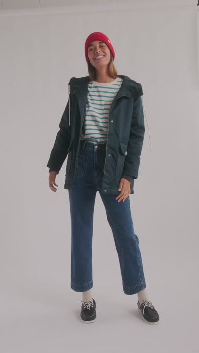 Un design à col montant avec un cordon de serrage en coton bio emprisonne la chaleur créée par cette superbe parka en toile. Une capuche douillette, une patte de boutonnage zippée et une doublure en polaire sherpa protègent des éléments.