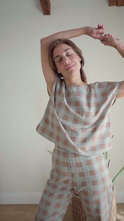 Une coupe oversize avec un motif à carreaux et des mini découpes latérales.