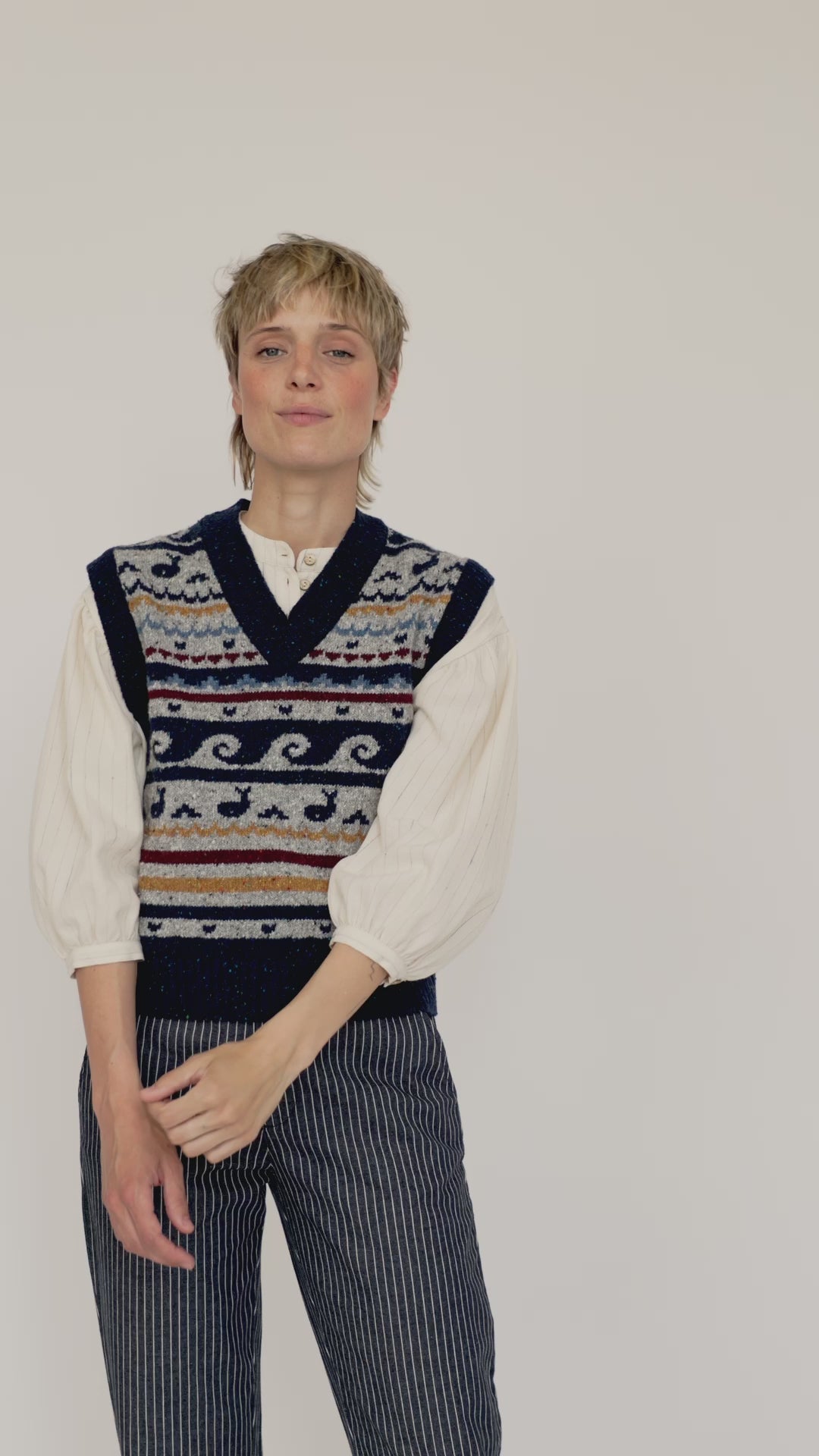 TWOTHIRDS of the world is covered by ocean. Our Milneland body warmer knit embodies every drop. An intricate jacquard design features whales, waves and colourful neps.
